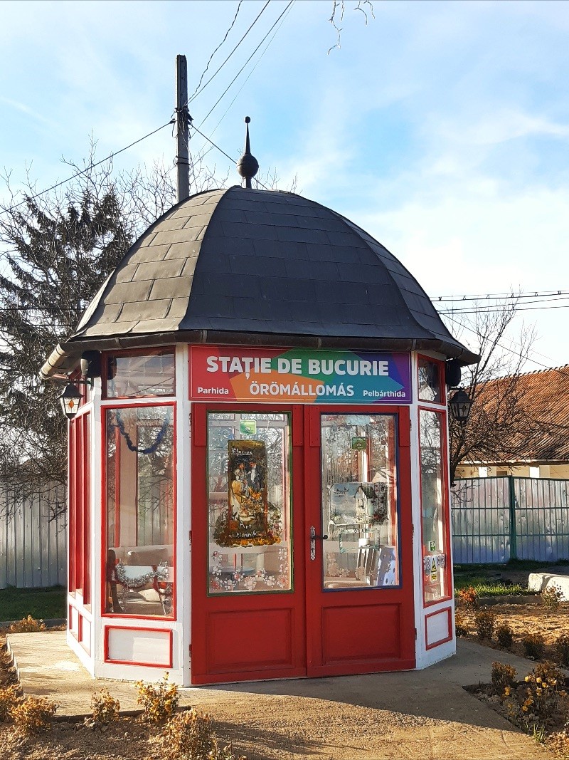 | Am cumparat un magazin de flori din Oradea pe care l-am desfacut bucata cu bucata, l-am restaurat, l-am dus la 20 de kilometri departare, in ultimul sat de pe granita de Vest a Romaniei si l-am transformat in statie de autobuz pentru copii. Totul din donatii si cu ajutorul a aproximativ 80 de oameni care au dorit sa se implice. I-am spus “Statie de bucurie” pentru ca este mai mult decat o simpla statie pentru autobuzul scolar: are muzica non-stop, carti gratis, colt de citit si e colorata, luminoasa si primitoare.