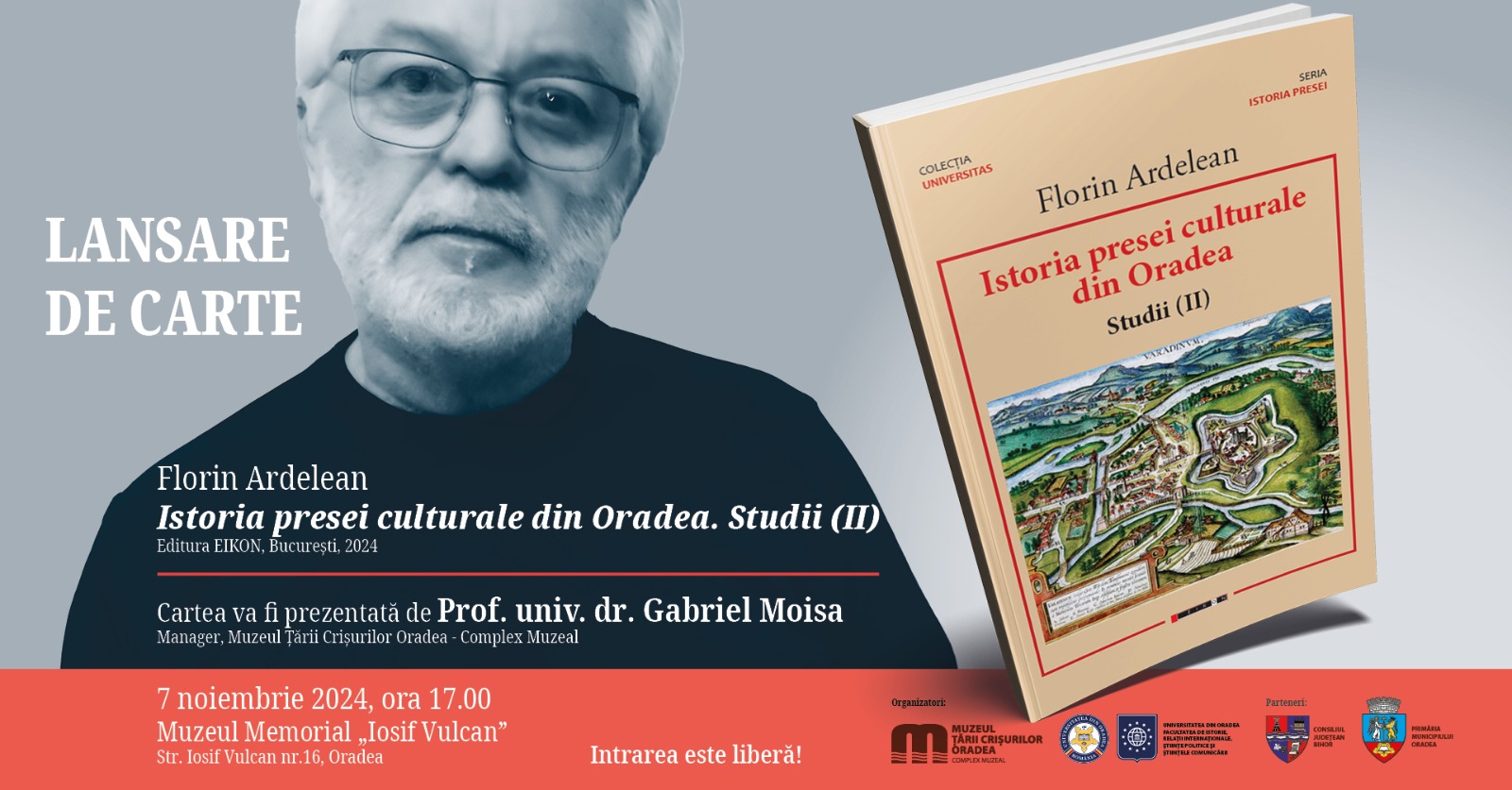 Muzeul Țării Crișurilor Oradea – Complex Muzeal organizează, cu sprijinul Consiliului Județean Bihor și al Primăriei Municipiului Oradea, lansarea cărții . (), al cărei autor este și care a apărut la Editura Eikon, București, 2024. Evenimentul va avea loc în 7 noiembrie a.c., de la ora 17.00, la Muzeul Memorial „Iosif Vulcan” (Str. Iosif Vulcan nr. 16).