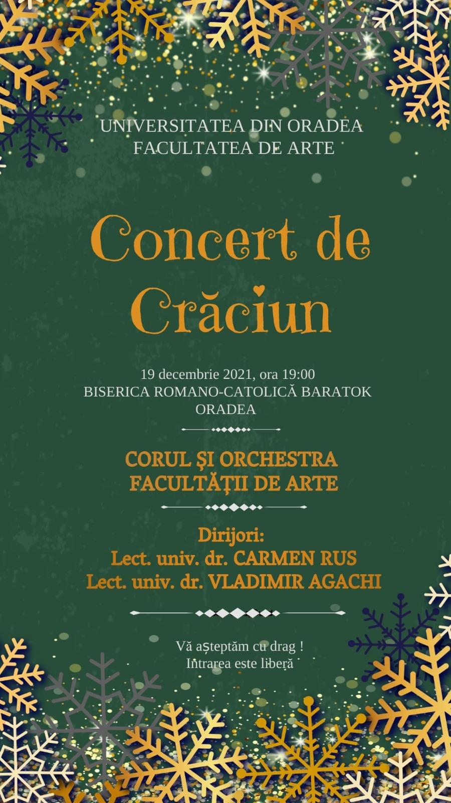 În data de 19 decembrie 2021, începând cu ora 19:00, la Biserica Romano Catolică Baratok, Departamentul de Muzică al Facultății de Arte, Universitatea din Oradea, invită întreaga comunitate academică și orădenii la un concert inedit de Crăciun unde își vor da concursul corul și orchestra Facultății de Arte sub bagheta dirijorală a doamnei lect. univ. dr. Carmen Rus și al domnului lect. univ. dr. Vladimir Agachi.