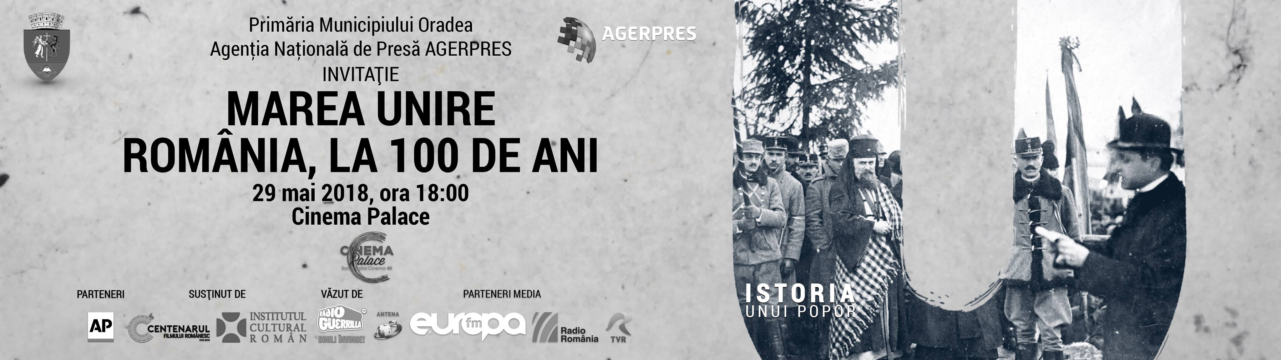 Documentarul „Marea Unire – România la 100 de ani” realizat de Agenția Națională de Presă AGERPRES va fi prezentat săptămâna viitoare și la Oradea. Lansarea documentarului va avea loc marți, 29 mai ora 18, la Cinema Palace a complexului Lotus Center (sala 3), în prezența realizatorilor.