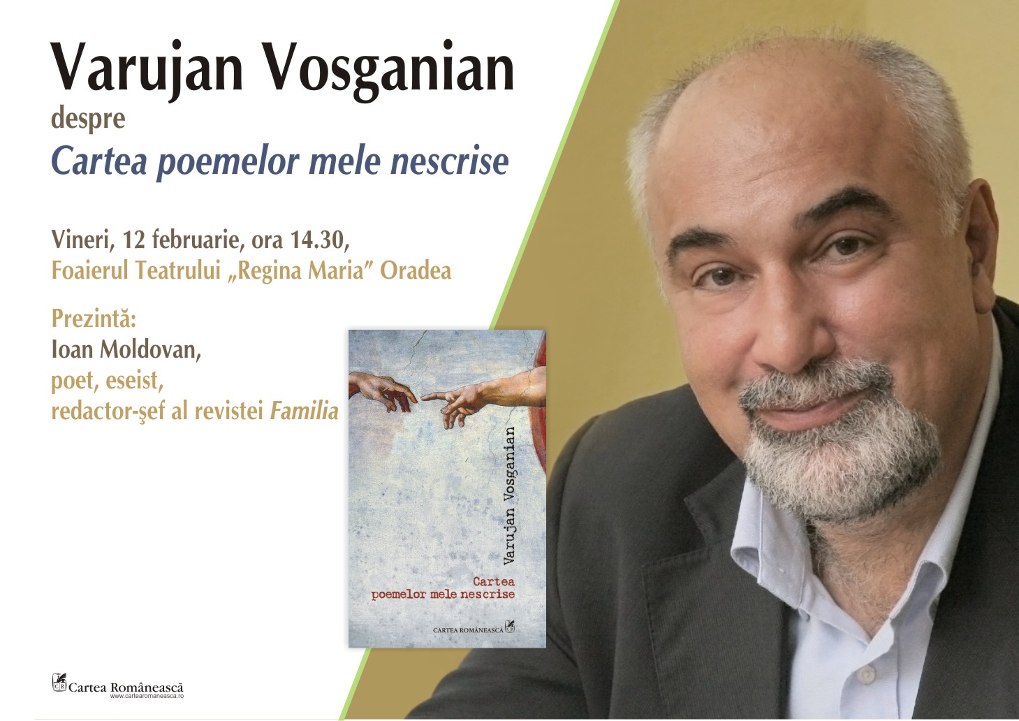 Oradea a avut bucuria de a-l găzdui pe unul dintre cei mai prestigioşi autori români contemporani, cu prilejul lansării volumului „Cartea poemelor mele nescrise”, purtând semnătura lui Varujan Vosganian. poet, prozator și politician de etnie armeană, ale cărui opere sunt nominalizate și premiate atât în țară, cât și peste hotare.