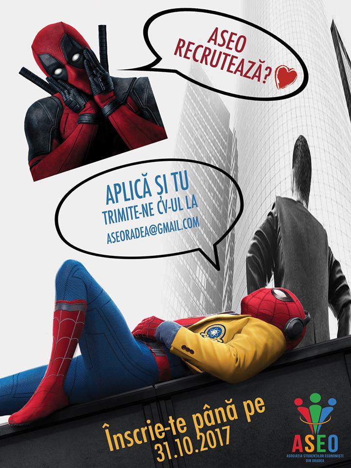 Echipa ASEO derulează în perioada 09-31 octombrie 2017 campania de recrutare, care în acest an îi are în prim-plan pe Eroii Marvel, bazându-se pe imaginea conturată de aceștia. Prin această asociere cu super eroii din benzile desenate, tinerii studenți încearcă să transmită ideea că prestând activitatea de voluntariat te transformi într-un erou pentru comunitatea din care provii, iar acum este prilejul perfect pentru a deveni unul din eroii de care are nevoie mediul academic.