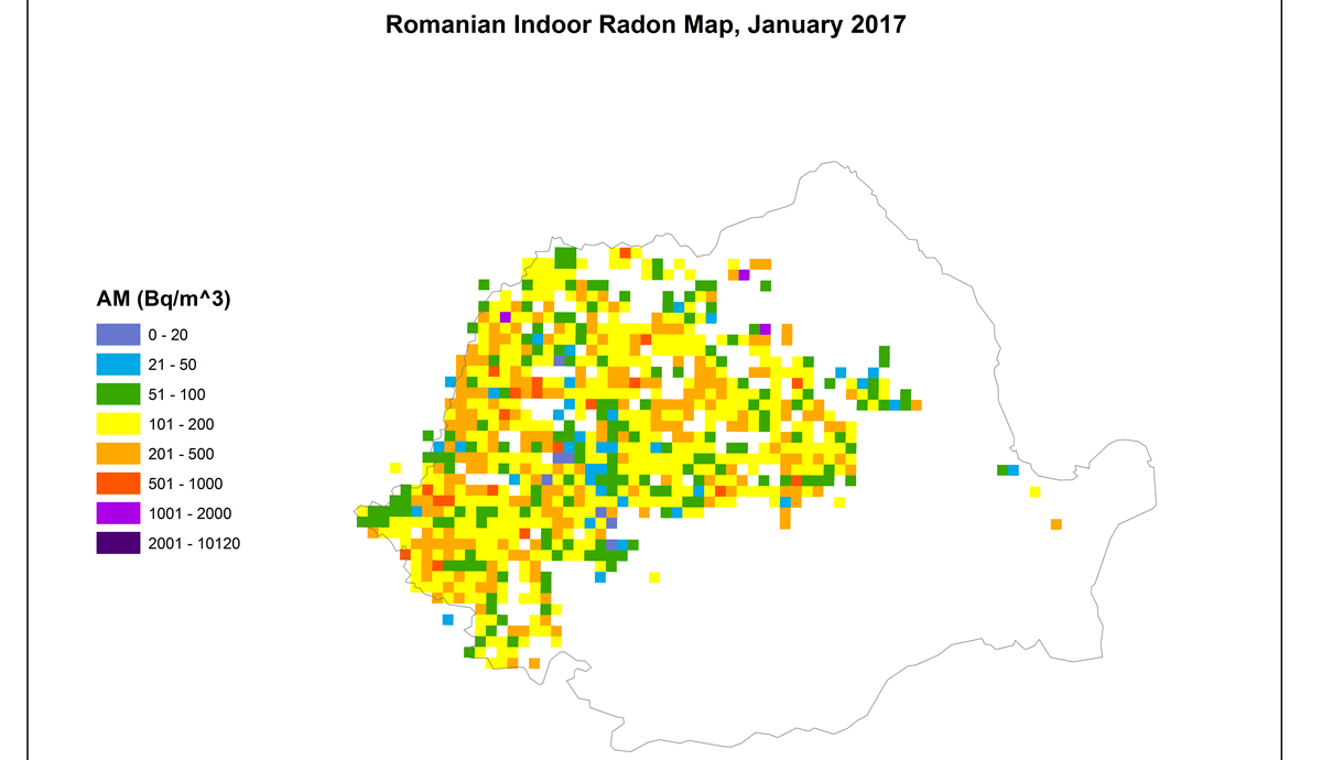Am realizat prima hartă de radon din România, cu zonele de risc, iar ţara noastră se află într-un top negativ al valorilor de radon din Europa. Pe baza a aproximativ 5.000 de măsurători de radon interior, media expunerii în România ar fi de 176 Bq (Becquerel)/mc, mai mult de 11% din rezultate fiind peste nivelul legiferat, de 300 Bq/mc.