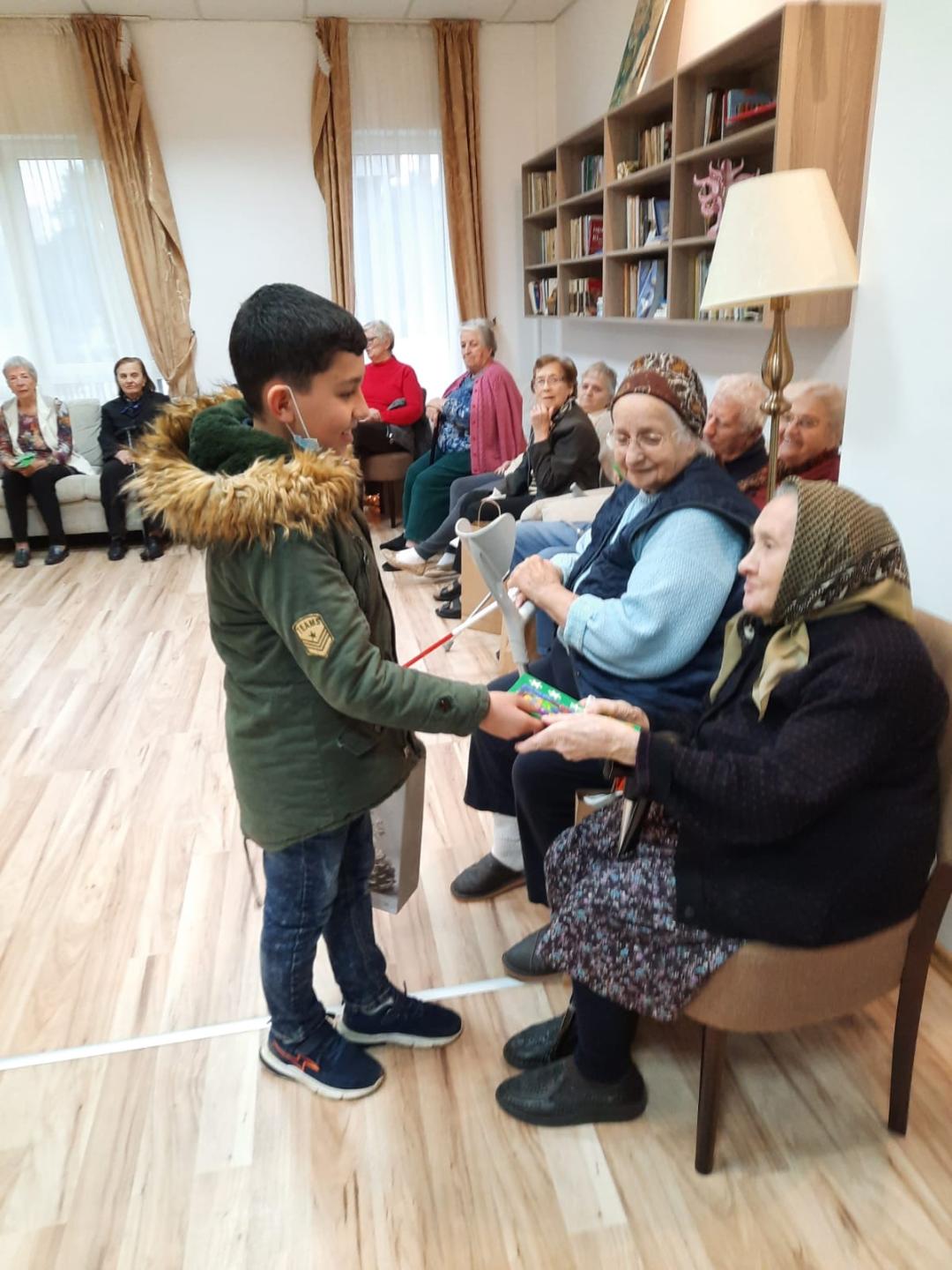 Masa de prânz servită aici a energizat trupurile micuțe, iar cadourile oferite reciproc au făcut ca acest eveniment să rămână, deopotrivă, în sufletele tuturor celor prezenți: bunicile din centrul rezidențial au pregătit, din timp, pentru fiecare copil, fulare și căciuli împletite cu multă îndemânare, dragoste și cu multă căldură, iar copiii au oferit, la rândul lor, felicitări vesel colorate și lucrate cu mânuțele lor, în care au pus mai ales inocența sufletelor pe care le poartă la orice pas.