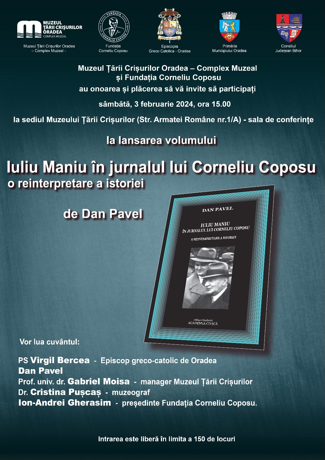 Muzeul Țării Crișurilor Oradea – Complex Muzeal și Fundația „Corneliu Coposu”, împreună cu Episcopia Greco-Catolică Oradea și Fundația „Academia Civică”, în parteneriat cu Consiliul Județean Bihor și Primăria Municipiului Oradea, organizează, sâmbătă, 3 februarie 2024, de la ora 15.00, lansarea volumului „Iuliu Maniu, în jurnalul lui Corneliu Coposu. O reinterpretare a istoriei”, autor Dan Pavel.