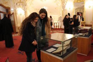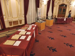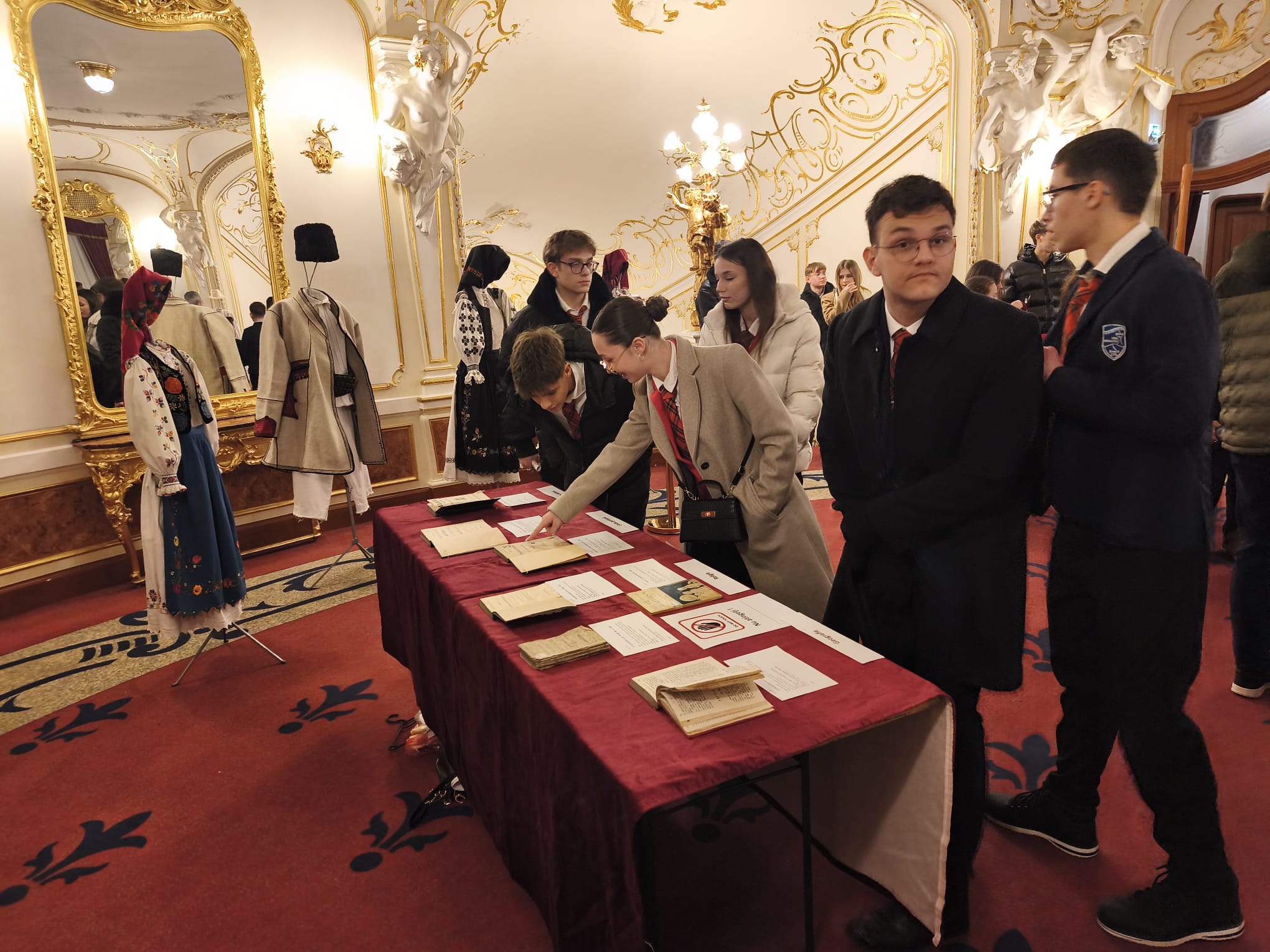 Publicul care a venit la spectacol a avut ocazia să întâlnească, în foaierul de la etaj al teatrului, volume de referință ale „Școlii Ardelene” precum „Gramatica lui Micu-Șincai” (Viena, 1780), „Povățuire cătră aritmetică” (Buda, 1816), „Ortografia lui Petru Maior” (Buda, 1819), și „Gramatica lui Ioan Alexi” (Viena, 1826). Totodată, depășind limita cronologică a intervalului cărții vechi românești (1830), publicul a vizionat și alte manuale, mai cunoscute sau mai puțin cunoscute, din vechile provincii locuite de români. Expoziția a fost organizată în două secțiunii mari, anume „Carte veche românească” și „Carte modernă românească”. Pentru că spațiul evenimentului a fost generos și de înaltă ținută arhitecturală, întâlnirea publicului cu manualele școlare s-a făcut, aproape ca la școală, volumele fiind organizate pe discipline