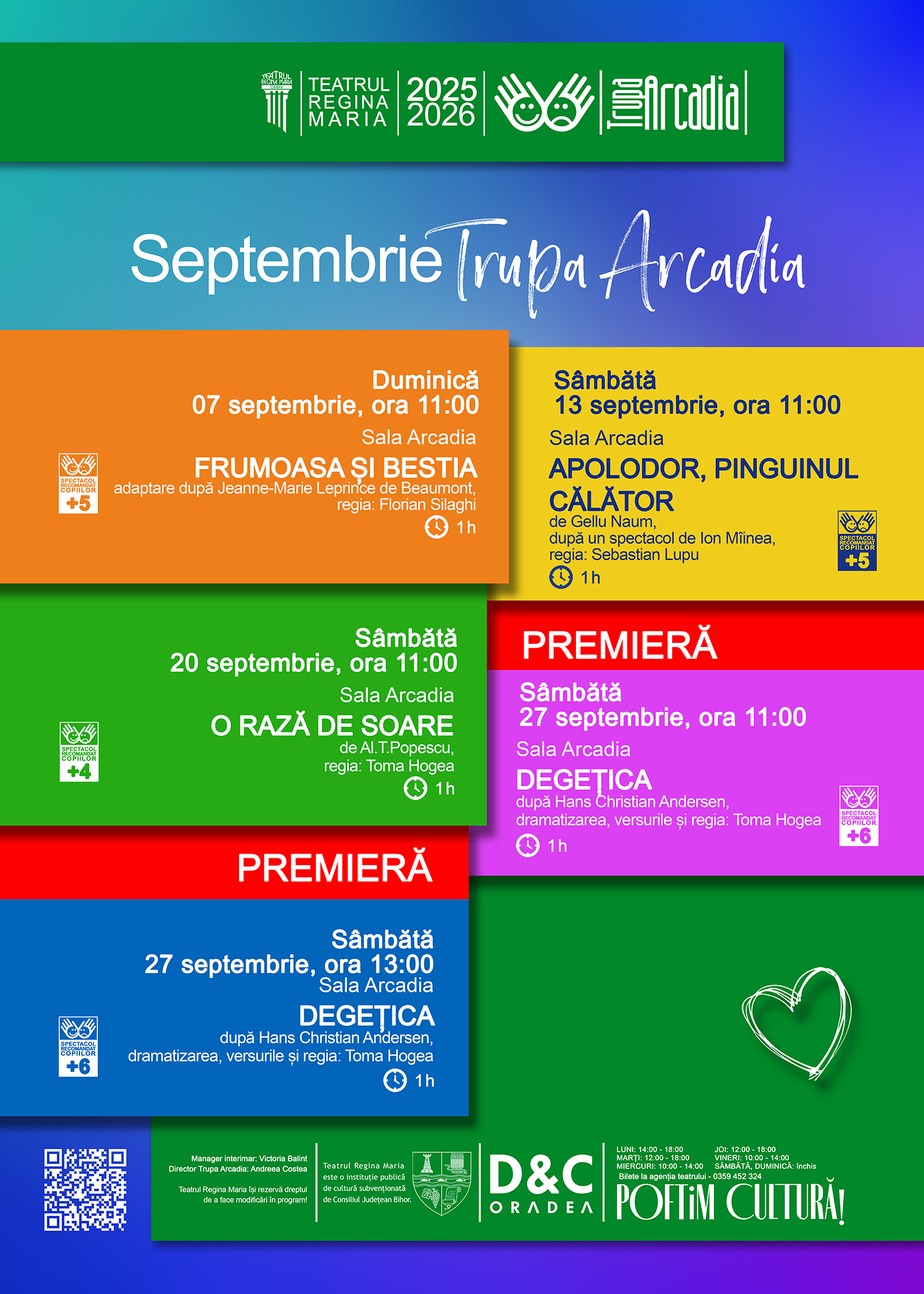 Trupa Arcadia a Teatrului Regina Maria pregătește în noua stagiune povești remarcabile pentru micii spectatori orădeni. Acestea vor fi puse în scenă de către regizori premiați, care revin cu entuziasm la Oradea, după ce au montat deja și alte spectacole de succes în repertoriul trupei.