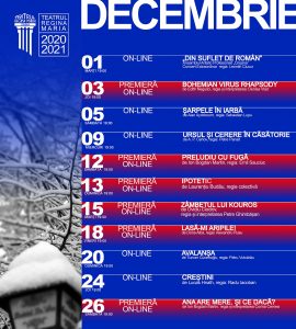 Programul lunii decembrie este mult mai complex. Vă invităm să-l consulați pe site sau pe pagina de Facebook //Teatrul Regina Maria și să vă faceți rezervare din timp la evenimentele programate. Rezervări se pot face la numerele de telefon 0753 404 257 (Virginia Oanțo) și 0752 165 001 (Bianca Segărceanu) – departamentul de organizare spectacole – sau la adresa de e-mail: organizare.trm@gmail.com. Spectatorii care își fac rezervare la unul sau mai multe spectacole, vor primi link-ul și codul de acces cu o oră înainte de începerea acestora. Spectacolele lectură se vor putea urmări și în transmisiune live pe Facebook. Toate reprezentațiile programate în luna decembrie sunt cu titlu gratuit. Vizionare plăcută!