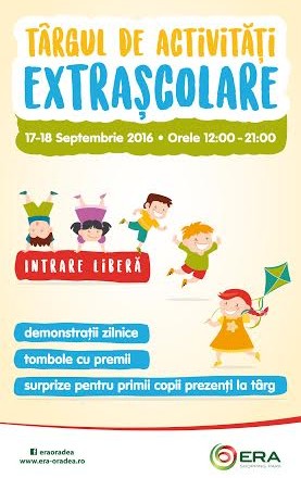 Târgul de activităţi extraşcolare se desfăşoară la acest sfârşit de săptămână, sub cupola centrului comercial ERA Park, în zilele de 17 şi 18 septembrie şi în zona galeriei Carrefour. În cele două zile, între orele 12-21, copiii sunt invitaţi, într-o atmosferă veselă şi captivantă, la ateliere de creaţie şi cursuri de teatru, limbi străine, ateliere