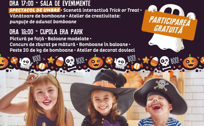 Pregătiți-vă costumele, asigurați-vă săculețele și veniți la vânătoarea de bomboane! ERA Park marchează sărbătoarea de Halloween cu o multitudine de activități menite să le facă ziua cu adevărat specială celor mici. Duminică, 29 octombrie, toți copiii sunt invitați la ”Halloween Party”, cu spectacole, costume de vrăjitoare, ateliere de creativitate și multe surprize. Activitățile se vor