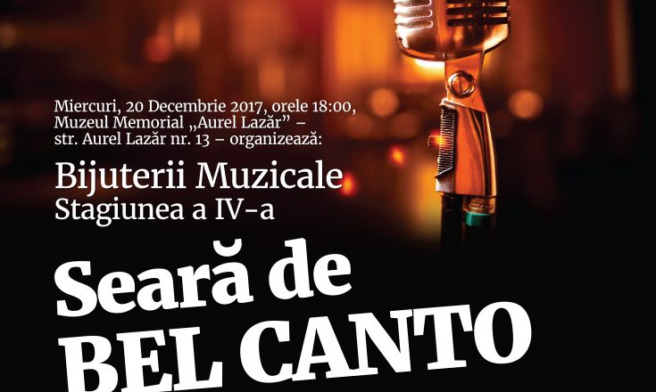 Miercuri, 20 decembrie 2017, la Muzeul Memorial „Aurel Lazăr” de la ora 18, are loc o nouă ediţie a Seratelor cu Bijuterii Muzicale, o seară ”Bel Canto”, care reunește pe scenă tineri talentați cu voci angelice. Este vorba despre sopranele Valentina Pușcaș și Rebeca Mitrașca, baritonul Mădălin Claudiu și basul Dinu Șerban Ioan. Tinerii interpreți se