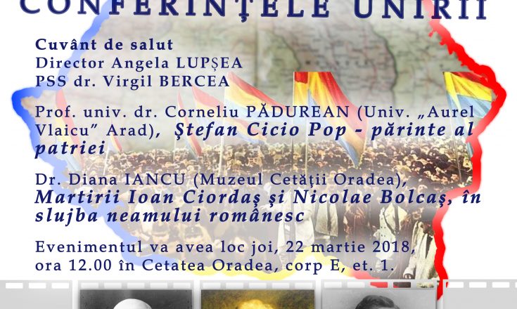 Biblioteca Judeţeană „Gheorghe Şincai” Bihor, Episcopia Greco-Catolică Oradea organizează Conferinţele Unirii. Programul cuprinde: Salutul adresat participanților de Angela Lupșea, Directorul Muzeului Cetății Oradea și de Preasfinţia Sa dr. Virgil Bercea. Conferențiază: Prof. univ. dr. Corneliu Pădurean de la Univ. „Aurel Vlaicu” Arad, despre ”Ştefan Cicio Pop, părinte al patriei” și Dr. Diana Iancu (Muzeul Cetăţii Oradea), despre ”Martirii