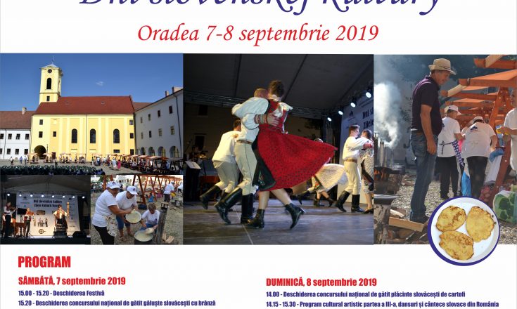 Uniunea Democratică a Slovacilor și Cehilor din România organizează, în Oradea, în perioada 7 – 8 septembrie, a IV- a ediție a Zilelor Culturii Slovace. Manifestările se vor desfășura în Cetatea din Oradea și vor cuprinde un program de cântece și dansuri slovace din zona Bihorului. Totodată se va organiza un concurs – faza națională