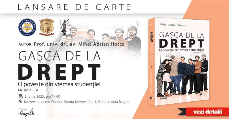 Facultatea de Drept a Universității din Oradea, în parteneriat cu Grupul editorial Universul Juridic, organizează joi, 5 iunie 2025, ora 17.00, în Aula Magna a instituției, evenimentul de lansare a ediției a II-a a volumului „Gașca de la Drept”, semnat de prof. univ. dr. Mihai Adrian Hotca, avocat penalist și rector al Universității „Nicolae Titulescu” din București.