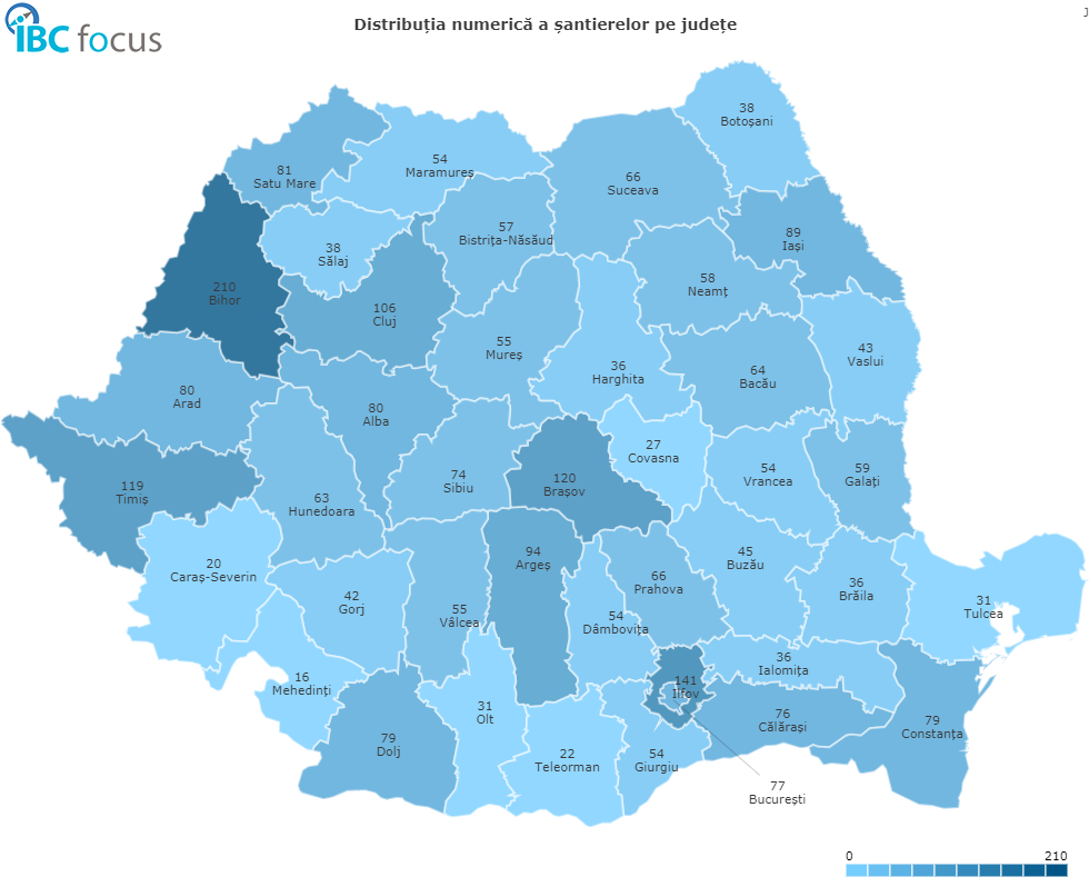 Potrivit cifrelor oferite de asistența virtuală de ofertare pentru șantiere și proiecte, Victa.ro, domeniul industrial este cel mai bine reprezentat în județele: București-Ilfov (218 proiecte), Bihor (210 proiecte) și Brașov (120 proiecte). În ceea ce privesc resursele financiare, deși există județe cu mai multe investiții, identificăm diferențe mari la valoarea și suprafața medie a investițiilor. Astfel, există județe cu un număr mai mic de șantiere, dar cu valoare și suprafață mai mari. Un astfel de caz este județul Maramureș care pe parcursul perioadei analizate a însumat un număr total de 54 de proiecte cu o valoare estimată 1.29 mld RON, județului revenindu-i astfel un loc în top 3 la nivel de distribuție valorică a șantierelor.