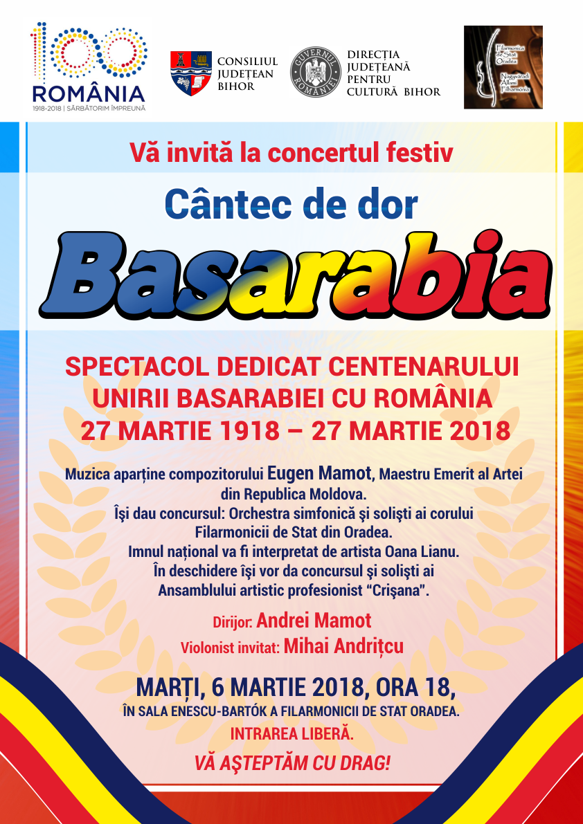 Direcţia Judeţeană pentru Cultură Bihor în parteneriat cu Consiliul Județean Bihor și cu Filarmonica de Stat Oradea vă invită marți, 6 martie 2018, ora 18, la concertul festiv “Cântec de dor – Basarabia”, care are loc în sala Enescu-Bartók a Filarmonicii de Stat Oradea.