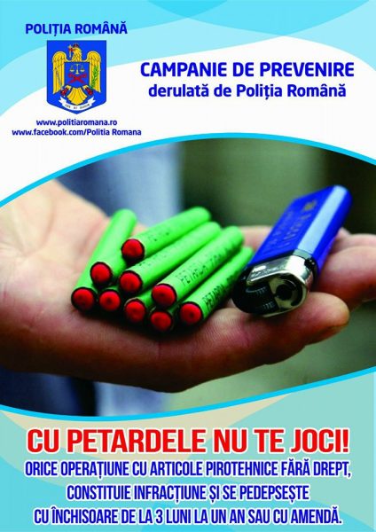 Oamenii legii țin să reamintească cetățenilor că operațiunile cu articole pirotehnice, efectuate fără drept, constituie infracțiune și se pedepsește cu închisoarea de la trei luni la un an.