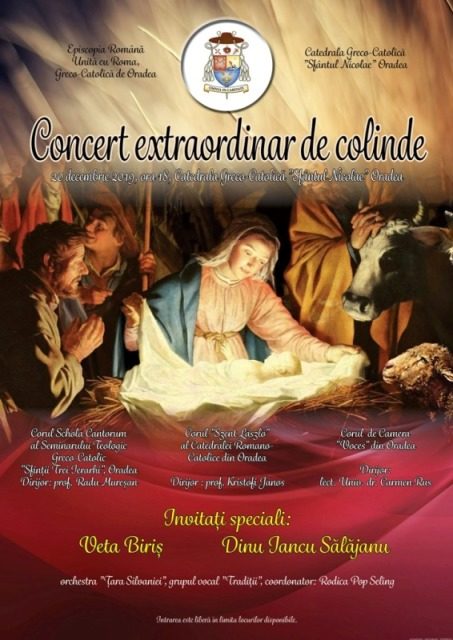 Episcopia Română Unită cu Roma invită publicul la Concertul Extraordinar de Colinde care va avea loc în data de 20 decembrie 2019, ora 18, în Catedrala Greco-Catolică ”Sfântul Nicolae” din Oradea.