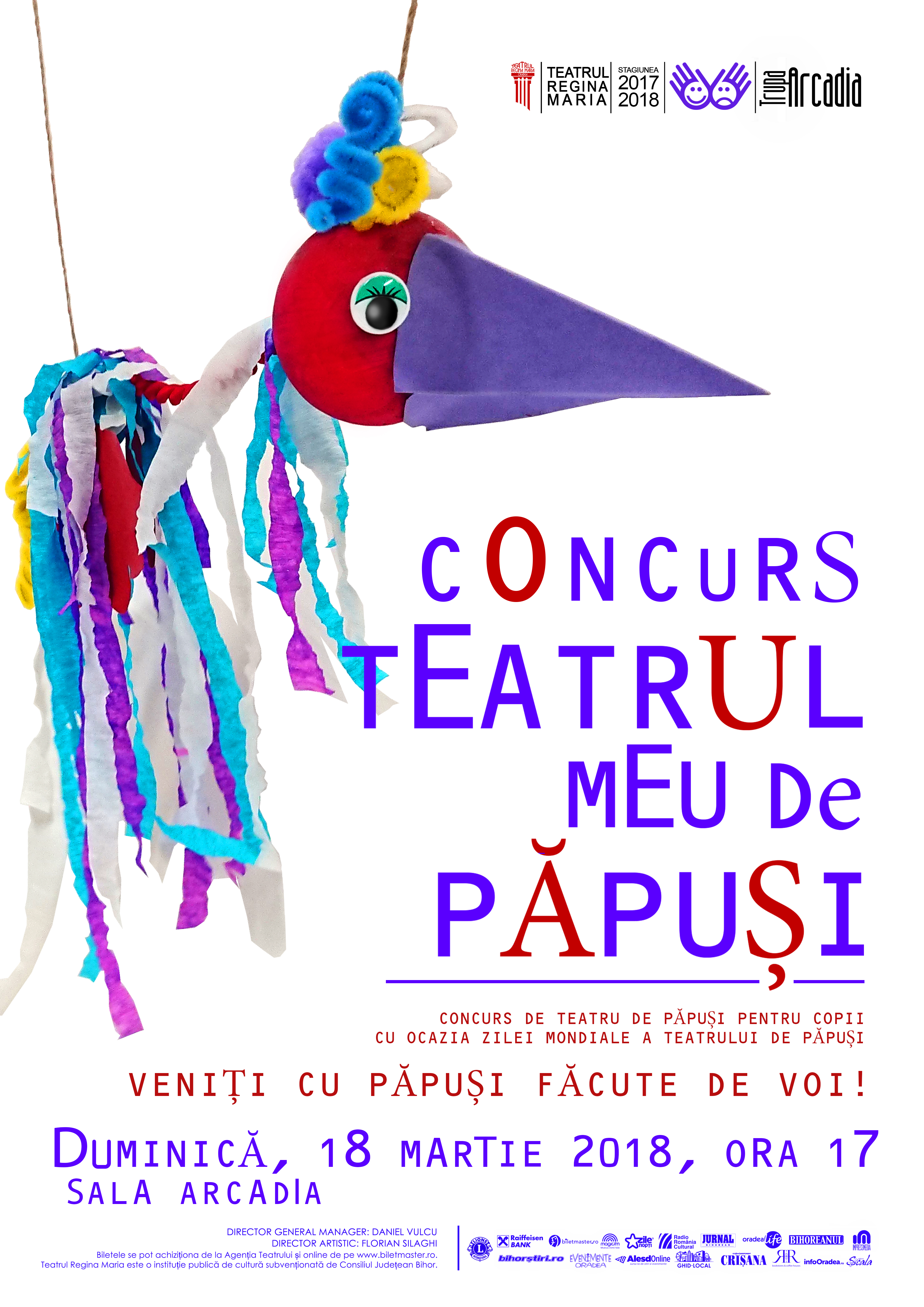 Ziua Mondială a Teatrului de Păpuşi se aniversează în fiecare an în data de 21 martie, iar Trupa Arcadia a Teatrului Regina Maria se pregătește din nou de sărbătoare. Micii spectatori sunt îndemnați să devină ei înşişi scenografi, regizori şi actori, în cadrul celei de-a treia ediții a concursului „Teatrul meu de păpuşi”, care se va desfășura duminică, 18 martie, de la ora 17, la Sala Arcadia.
