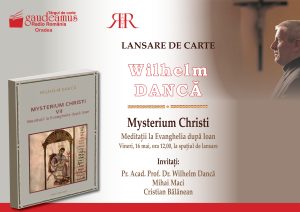 La ora 12,00, se va lansa volumul VII din seria de autor Mysterium Christi, intitulat Meditații la Evanghelia după Ioan (2025) a părintelui prof. dr. academician Wilhelm Dancă, sacerdot romano-catolic, cadru didactic al Facultății de Teologie romano-catolică a Universității din București, membru corespondent al Academiei Române (2013) și membru al Academiei de Științe și Arte din Salzburg (2017). Alături de autor, vor lua cuvântul Mihai Maci, cadru didactic la Universitatea din Oradea și Cristian Bălănean, preot greco-catolic și avocat.
