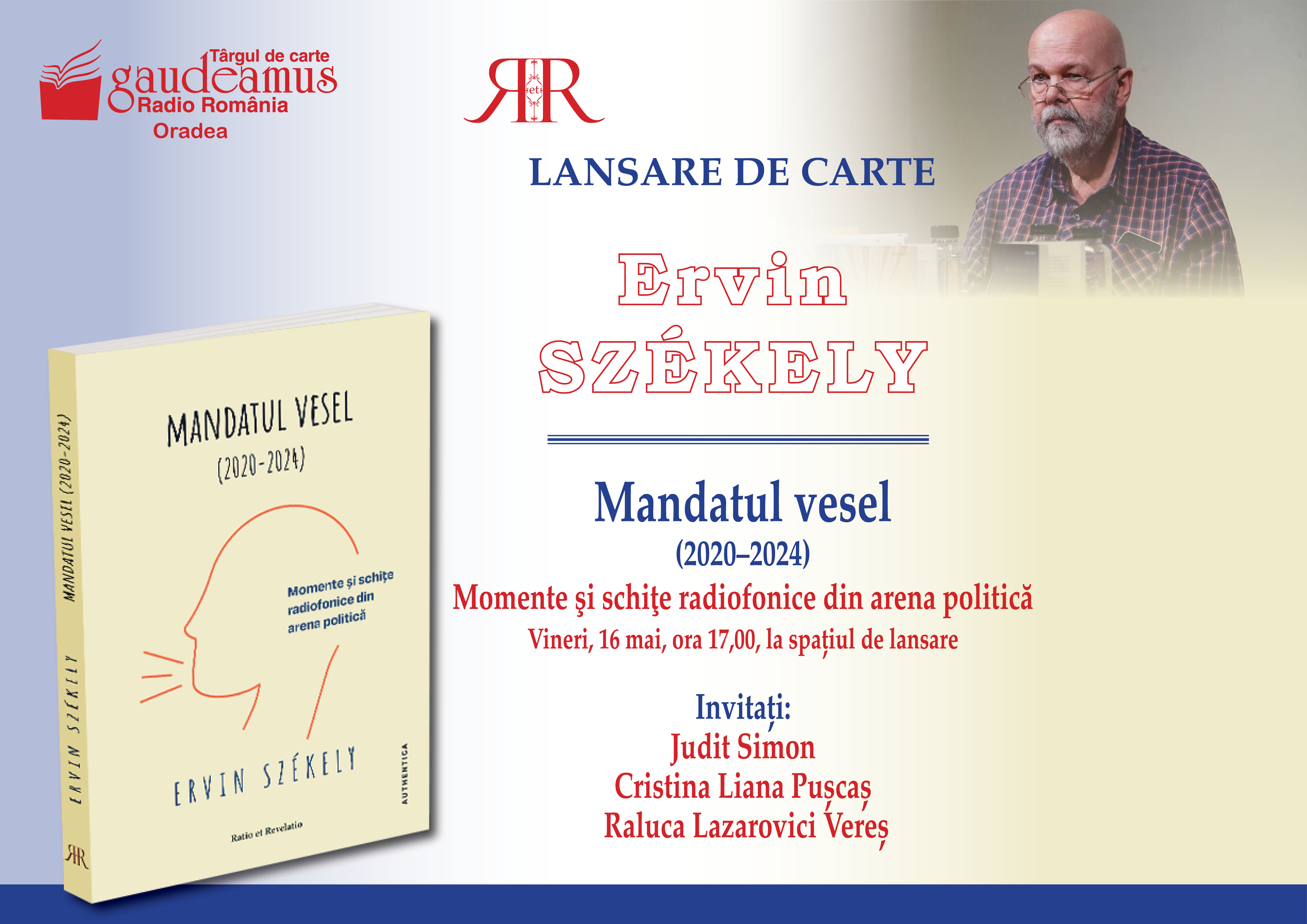 La ora 17,00, va avea loc lansarea volumului Mandatul vesel (2020-2024). Momente și schițe radiofonice din arena politică (2025), semnat de scriitorul și jurnalistul orădean Ervin Székely. Prin colecția de note radiofonice reunite în acest volum, cititorul are ocazia să analizeze societatea în care trăiește, prin lentilele omului de presă pur-sânge, excelent observator al fenomenelor sociale și politice din țară și din lume, cu puternice accente vizionare. La aceasta, se adaugă o inedită și utilă privire din interior – deosebit de interesantă pentru publicul român – asupra anumitor gesturi, declarații și intenții ale liderilor minorității din care autorul face parte, cea maghiară, dar și asupra altor figuri importante pe scena internațională. Alături de autor, vor lua cuvântul jurnalistele Judit Simon și Cristina Pușcaș, precum și editoarea Raluca Lazarovici Vereș.