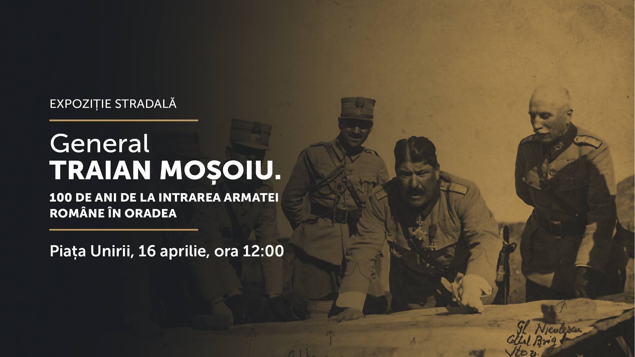 Muzeul Orașului Oradea – Complex Cultural organizează marți, 16 aprilie, la ora 12, în Piața Unirii, la vernisajul expoziției stradale „General Traian Moșoiu. 100 de ani de la intrarea Armatei Române în Oradea”. Totodată va fi lansată și broșura cu același nume.