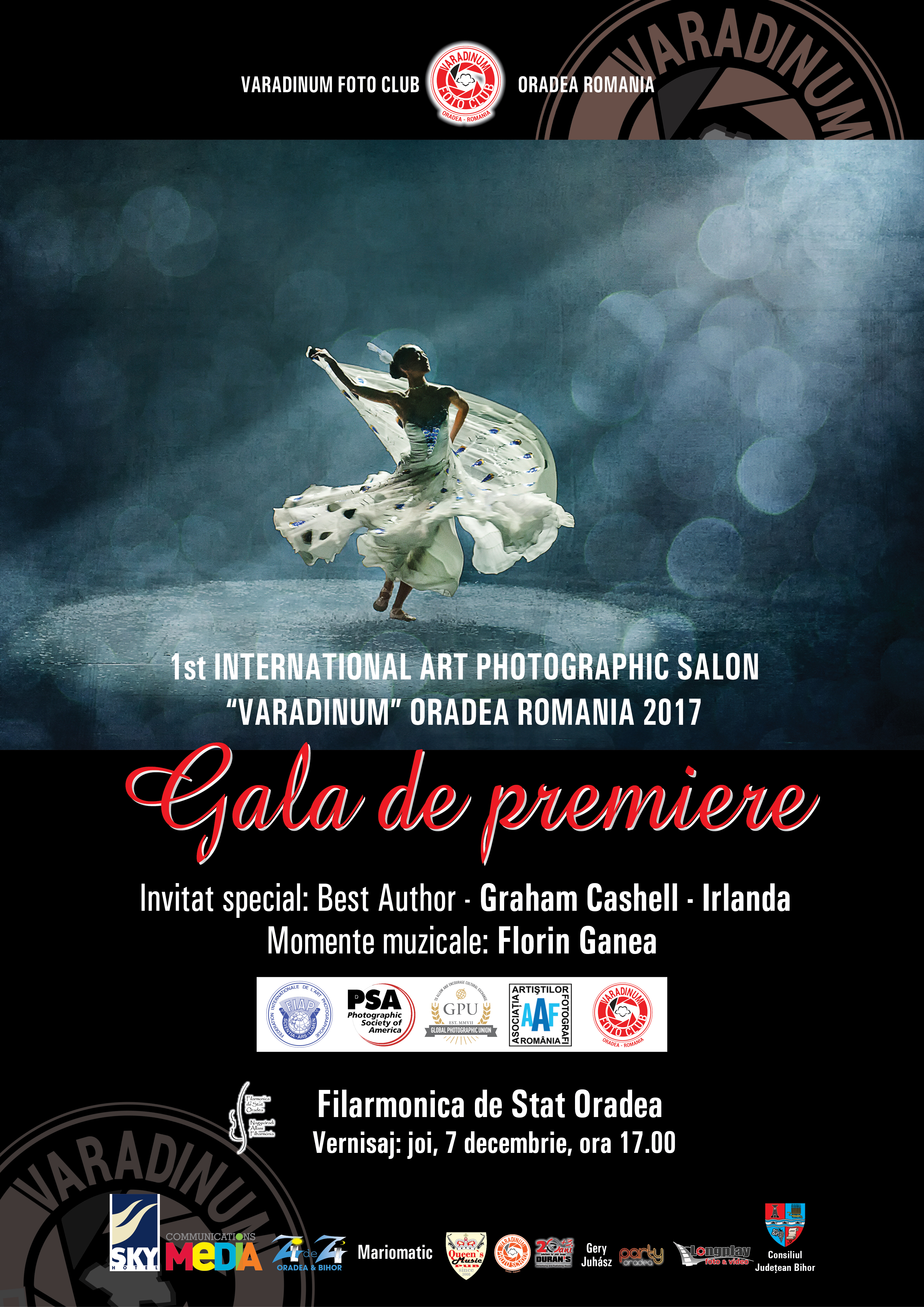 Gala de premiere și vernisajul primului Salon Internațional de Artă Fotografică ”Varadinum 2017”, are loc la Filamonica de Stat Oradea, joi, 7 decembrie, de la ora 17. Va fi prezent şi Graham Cashell din Irlanda, „Best Author”, cu cele mai multe acceptări şi premii din concurs, .