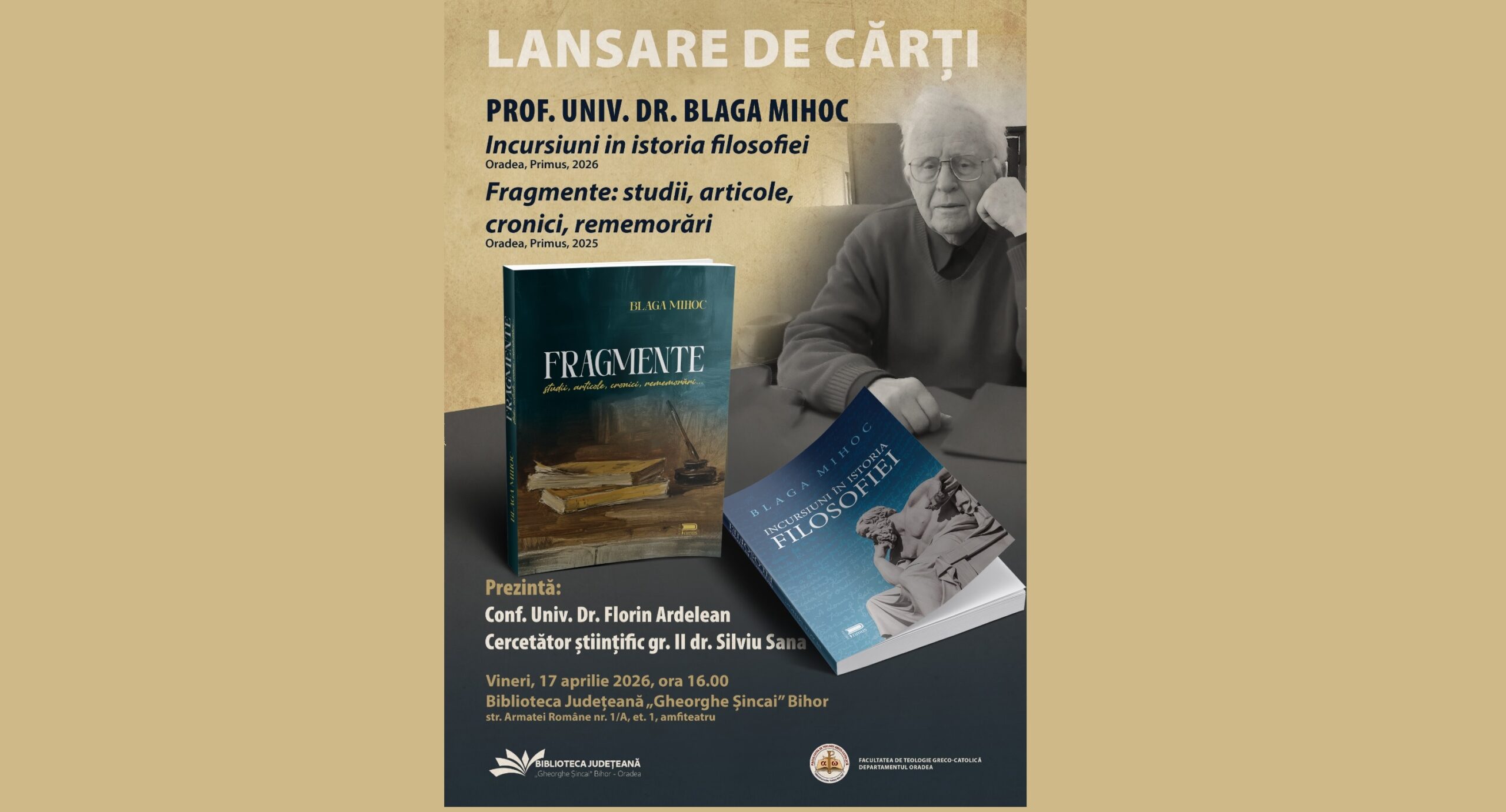 După-masa zilei de vineri, 17 aprilie 2026 ora 16.00, amfiteatrul Bibliotecii Județene „Gheorghe Șincai” Bihor din Oradea va fi gazda unui eveniment cultural excepțional dedicat profesorului universitar dr. Blaga Mihoc, o personalitate marcantă a scrisului istoric local și național. Cei care îl cunosc și îi apreciază valoarea lucrărilor sale, știu că profesorul și cercetătorul bihorean aduce „noutăți” chiar și atunci când acestea sunt din domeniul trecutului istoric sau filosofic. În cazul de față, este vorba de lansarea unor cărți, locul ales fiind chiar biblioteca unde, de-a lungul anilor, dr. Blaga Mihoc a poposit pentru a-și scrie lucrările istorice, amprenta lui fiind unică și direcționată spre luminarea „maselor”, precum odinioară făceau corifeii „Școlii Ardelene”.