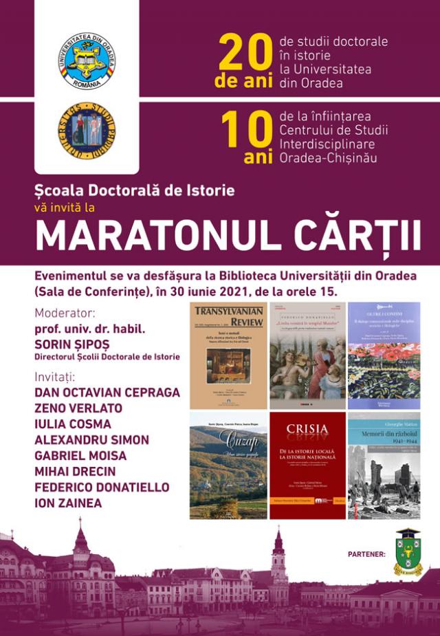 Conceput sub genericul „Maratonul cărții”, evenimentul, programat în 30 iunie a.c., la Biblioteca Universității din Oradea (începând cu ora 15), va oferi celor prezenți adevărate daruri editoriale, rod al cercetărilor interdisciplinare din sfera istoriografiei și a literaturii efectuate de universitarii și doctoranzii orădeni în parteneriat cu cercetători de la citadelele universitare partenere. Într-o atmosferă sublimată de simboluri, în care profesorul Sorin-Domițian ȘIPOȘ își va asuma rolul de moderator, cei prezenți vor trăi satisfacția prezentării unor tomuri recent apărute, în limbile română și italiană (periodice și volume de referință pentru istoriografia și cercetarea literară și lingvistică actuală), și a unora dintre autorii lor, invitați speciali: Dan Octavian CEPRAGA, profesor la Departamentul de Studii Lingvistice și Literare al Universității din Padova, acompaniat de iluștri cercetători, români și italieni, de la vechiul așezământ din regiunea Veneto: Zeno VERLATO, Iulia COSMA, Federico DONATIELLO, precum și Alexandru SIMION de la Centrul de Studii Transilvane din Cluj-Napoca.Eminenții magiștri orădeni Gabriel MOISA, Mihai DRECIN și Ion ZAINEA, prolifici și apreciați istorici, vor conferi, prin prezența lor, atractivitate și elevație academică festinului închinat cărții: Temi e metodi della ricerca storica e filologica. Nuove riflessioni tra Est ed Ovest, în „Transylvanian Review”, Vol. XXIX, Supplement No. 1, 2020, apărut sub egida Centrului de Studii Transilvane al Academiei Române, ediție îngrijită de Sorin ȘIPOȘ, Dan Octavian CEPRAGA, Laura ARDELEAN și Iulia COSMA; Federico DONATIELLO: Limba română în templul Muzelor. La lingua delle prime traduzioni teatrali romene, Editura Eikon; Oltre i confini. Il dialogo transnazionale nelle discipline storiche e filologiche, volum îngrijit de Dan Octavian CEPRAGA, Sorin ȘIPOȘ, Federico DONATIELLO, Dana-Maria FEURDEAN, Editura Criterion; Sorin ȘIPOȘ, Cosmin PATCA, Ioana BLAJEC: Cuzap. Album istorio-geografic, Ratio et Revelatio, Oradea; De la istorie locală la istorie națională (Lucrările sesiunii științifice a doctoranzilor în istorie, ediția a XIV-a, Oradea, 14-15 octombrie 2019), în Crisia, vol. 1, Supliment nr. 1, 2020, tom îngrijit de Sorin ȘIPOȘ, Gabriel MOISA, Alina-Carmen BRIHAN, BEÁTA Ménesi, Editura Muzeului Țării Crișurilor Oradea; Gheorghe MARIAN: Memorii din războiul 1941-1944, Ediție, studiu introductiv și aparat critic de Gabriel MOISA, Editura Mega, 2020.O adevărată sărbătoare a spiritului, sub semnul interdisciplinarității, un eveniment prin care Alma Mater Oradiensis își reconfirmă excelența în peisajul academic românesc și european.