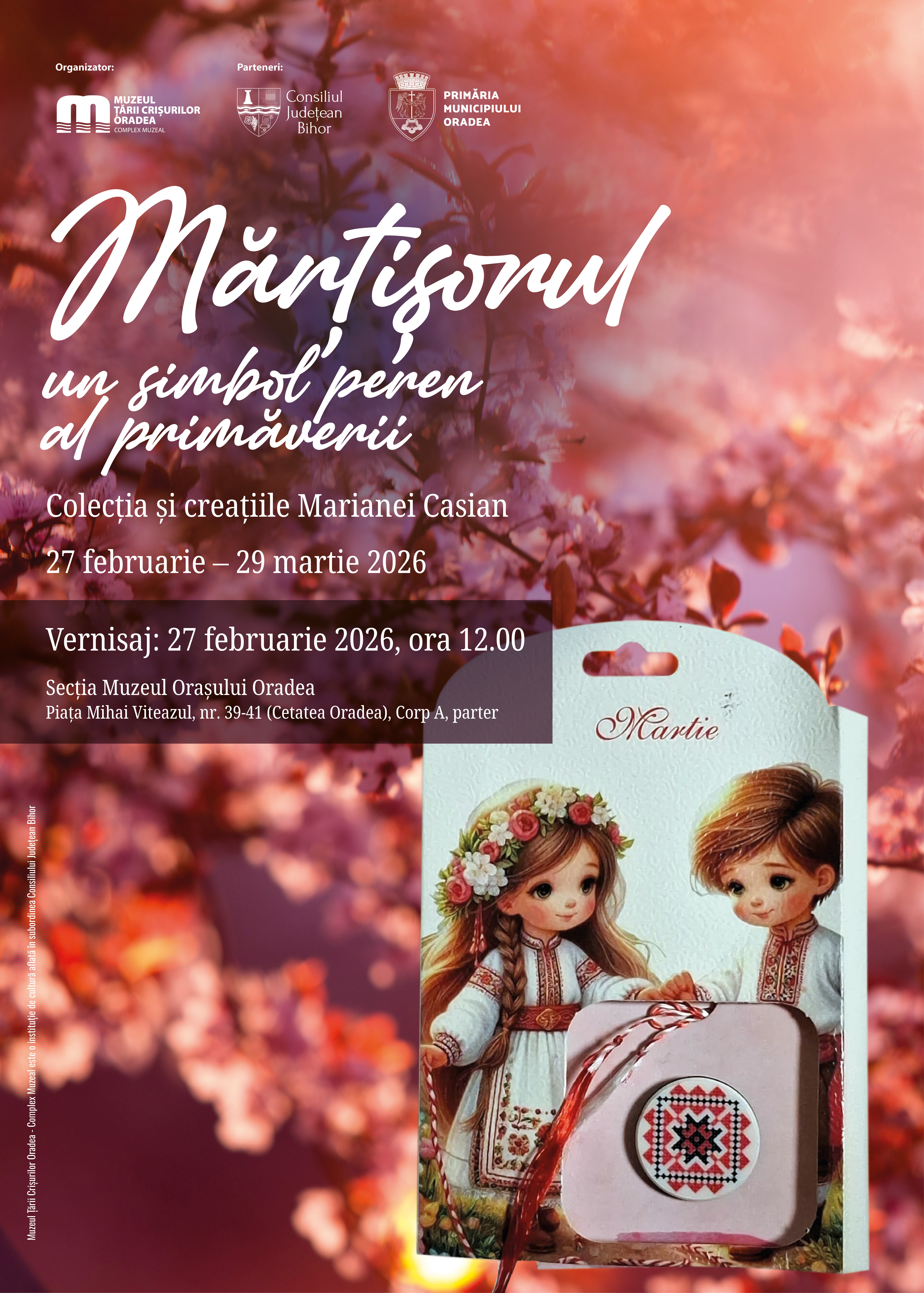 Muzeul Țării Crișurilor Oradea – Complex Muzeal, în parteneriat cu Consiliul Județean Bihor și Primăria Municipiului Oradea, organizează expoziția „Mărțișorul, un simbol peren al primăverii”, care cuprinde colecția și creațiile doamnei doctor Mariana Casian. Vernisajul va avea loc vineri, 27 februarie a.c. de la ora 12.00, la Secția Muzeul Orașului Oradea (Cetatea Oradea, Piața Mihai Viteazul nr. 39-41, corp A, parter).