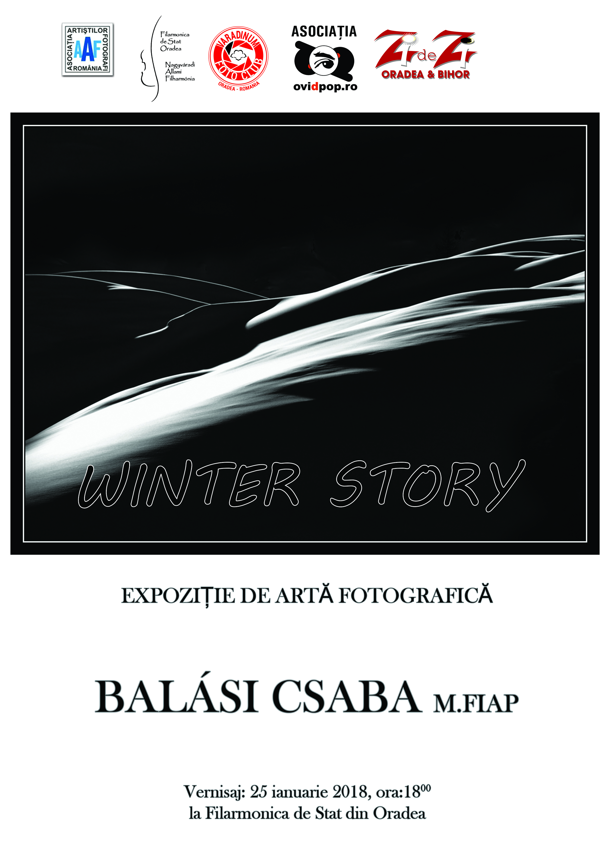 La Filarmonica de Stat Oradea, joi 25 ianuarie 2018,de la ora 18, are loc vernisajul expoziției ,,Winter Story” (Povestea iernii) avându-l ca autor pe Csaba Balasi din Miercurea Ciuc (MFIAP, EFIAP/g, ESFIAP) vicepreședintele Asociației Artistilor Fotografi din România și Ofițerul de legatură cu Federația Internațională de Artă Fotografică.