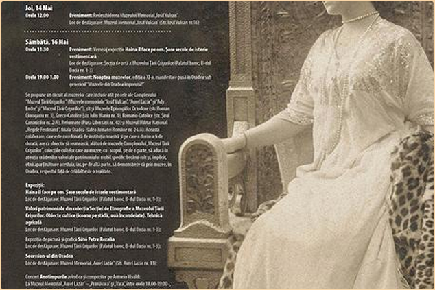 Programul manifestarilor: 13 mai Orele 11.30-11.45 Deschiderea oficială a evenimentului Loc de desfăşurare: Secţia de artă a Muzeului Ţării Crişurilor (Palatul baroc, B-dul Dacia nr. 1-3) Orele 12.00-13.00